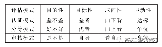 每种评估模式都有其特征(见表1)[3] ,认证模式判断的是与规定标准相比“差不差”和“有多差”,关注“差者”(差项)。即是为找出“差者”(差项),其基本取向是向下。这种模式能驱使“差者”(差项)达标。分等模式判断的是与规定标准相比“好不好”和“有多好”,关注“优者”(优项),基本取向是向上,能驱使争优。审核模式判断“是不是”,即该说的是不是说了(目标),说了的是不是做了(做法),做了的是不是有效(效果),无效的是不是改了(改进)。关注学校自身,不能进行高校间比较,基本取向是用自己的尺寸衡量自己。这种模式能驱使学校自律。